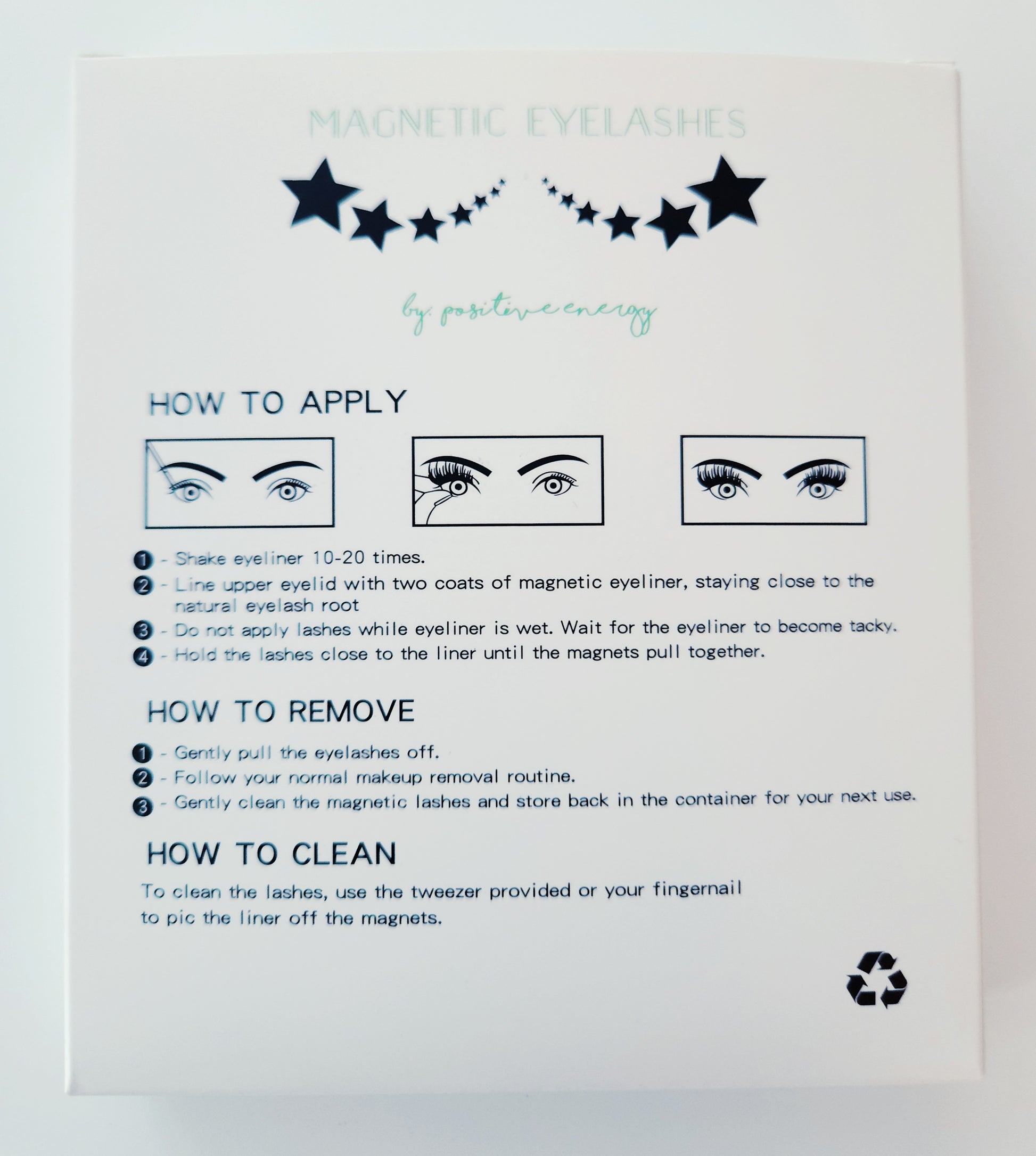 The set includes 5 pairs of magnetic eyelashes, 1 full tube of strong hold magnetic eyeliner and 1 tweezer.